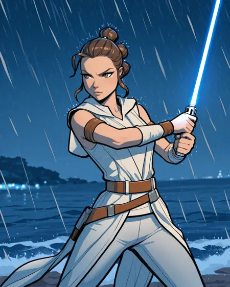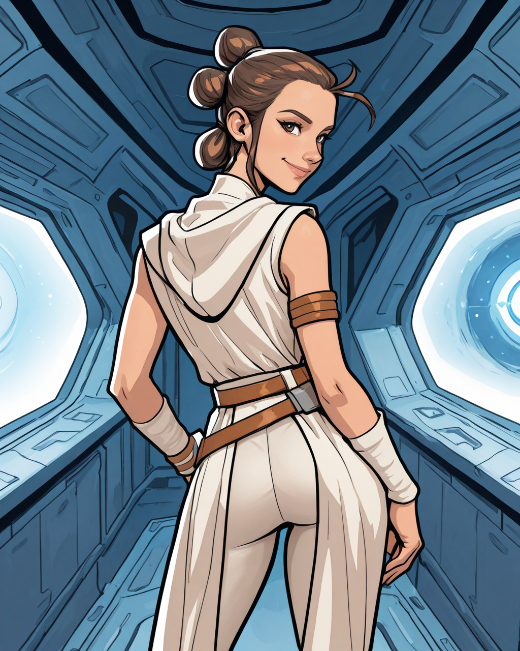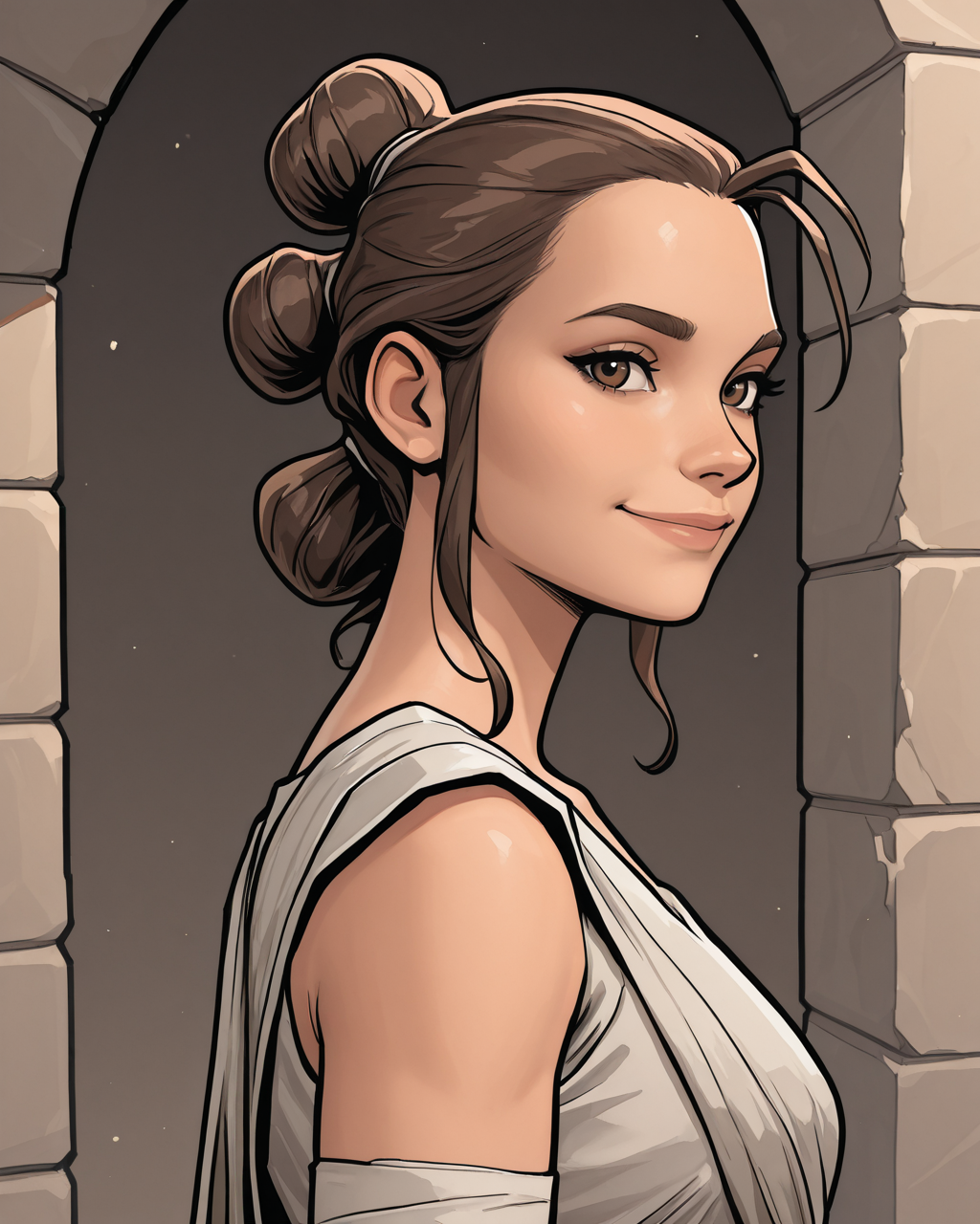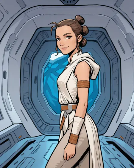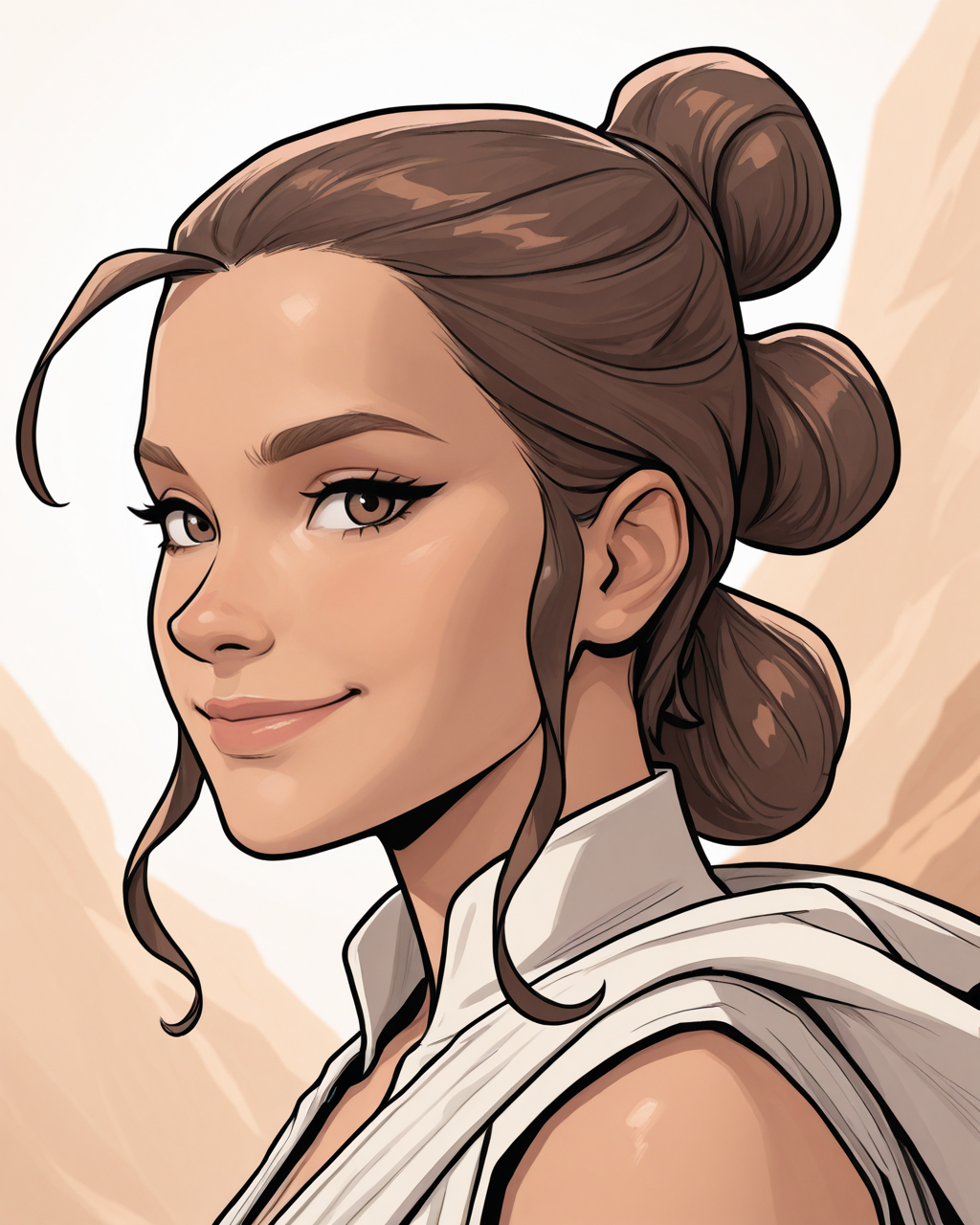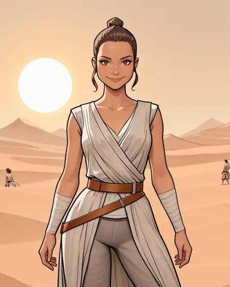 ジェダイ:reycomic、片側の髪、髪の結い、茶色の髪、茶色の目、白いチュニック、ベルト、腕輪、リストバンド、ショートパンツ、ブーツ