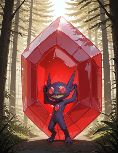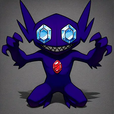 메가 형태: Mega-sableye, pokemon (creature), red gem eyes, holding a giant ruby, a hole in shape of jewel on torso