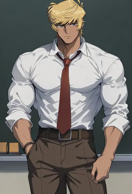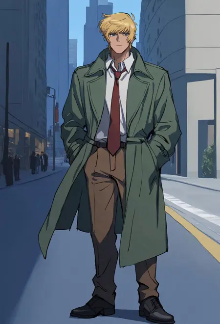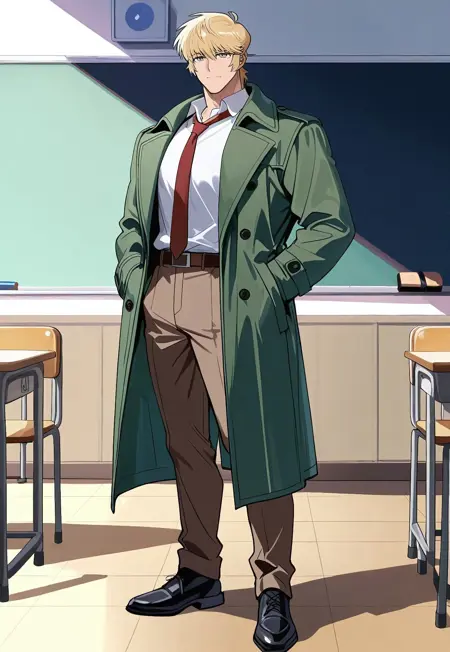 의상 옵션: 흰 셔츠, 칼라 셔츠, 녹색 트렌치 코트, 빨간 넥타이, 열린 칼라, 탱크탑, 상체 노출, 갈색 바지