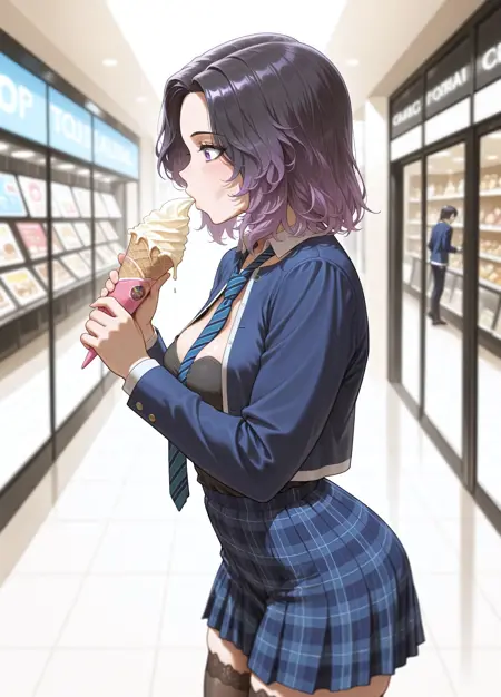 norjul, 1girl, solo, ツートーンヘア, グラデーションヘア, 黒髪, 紫髪, 短髪, 紫色の目, 開いた唇, 中程度の胸, 青いブレザー, 開いたブレザー, 長袖, 青いネクタイ, 縞模様のネクタイ, 解れたネクタイ, 黒いチューブトップ, 青いスカート, チェック模様のスカート, シャツ丈ストッキング, 黒い靴, スニーカー,
