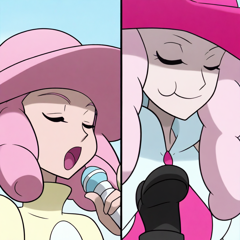 pink bandanna, bow bandanna, pink bow, light yellow dress, pink apron, sleeveless dress, black gloves, black tights, pink boots, frilly skirt,