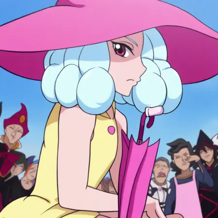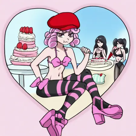 apple hat, beret, pink dress, puffy sleeves, black trim, scalloped hem, striped tights, pink and black stripes, pink platform shoes, high heels, parasol, frilly apron belt, wing-shaped belt,