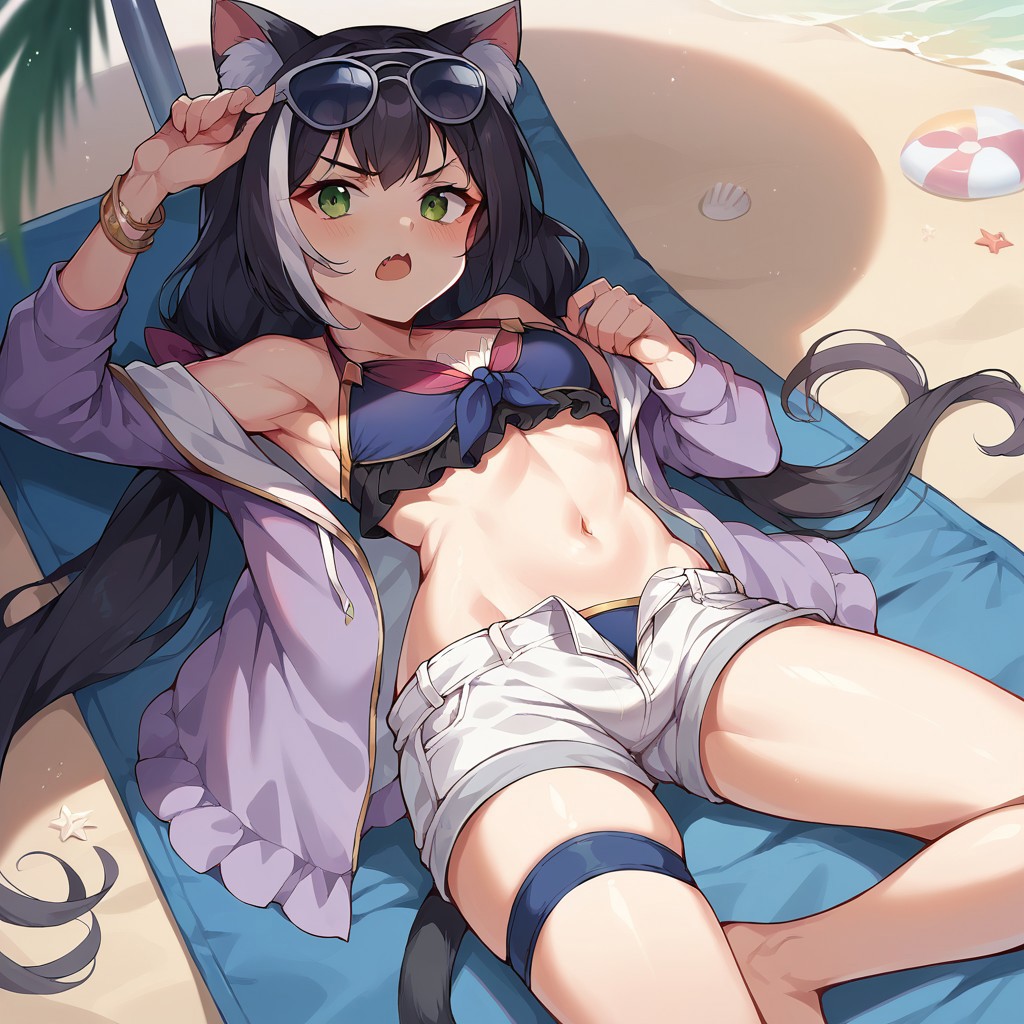 sunglasses on head, purple jacket, bikini, open shorts, thigh strap, sandals,