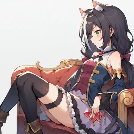 black hair, streaked hair, green eyes, twintails, hair ribbon, cat ears, cat tail,