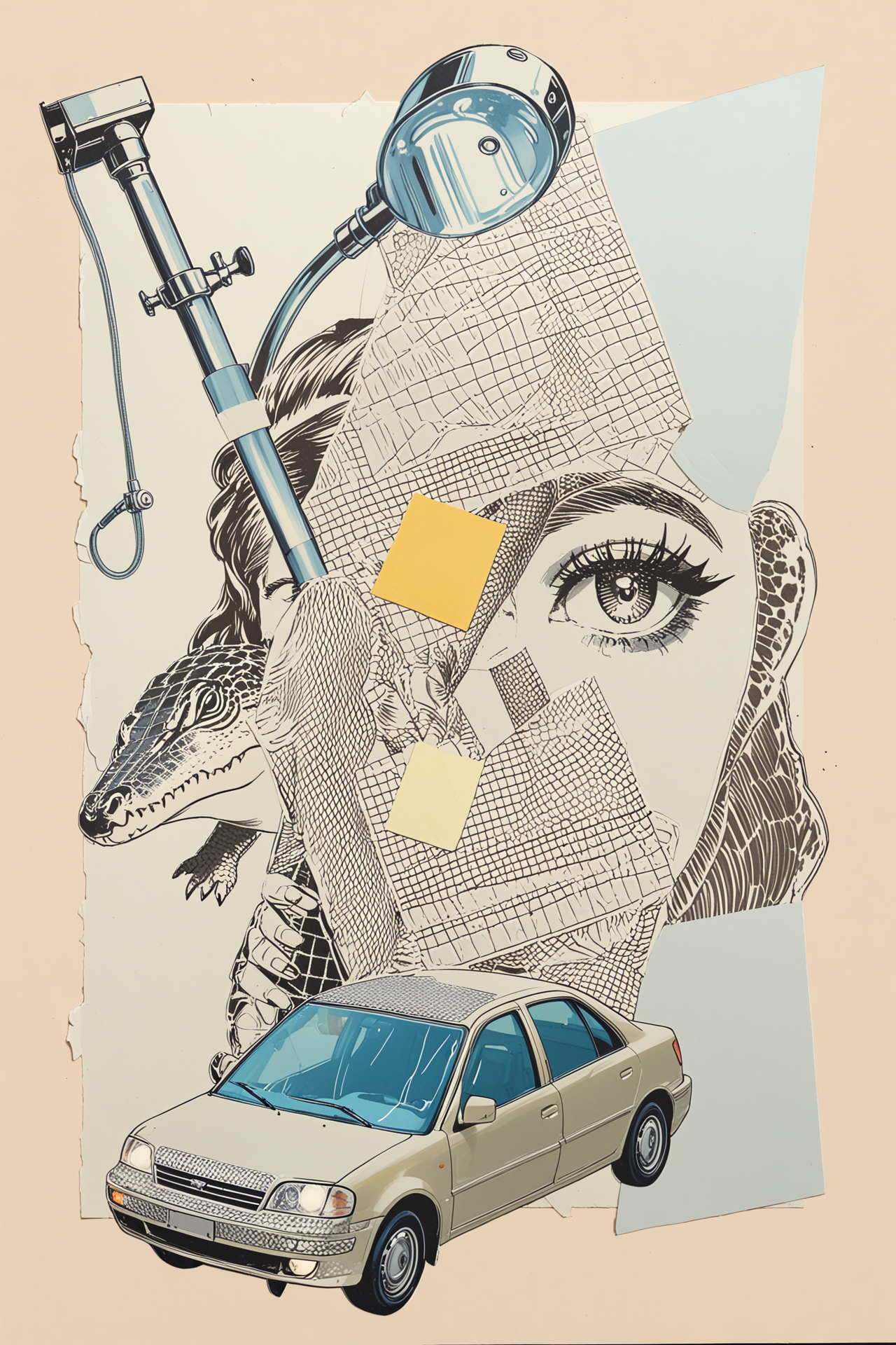 * absurdist 4 koma \(manga\), pop surrealism collage \(style\), hand-cut paper collage, ink drawing, halftone, greyscale, monochrome, manga panel, desaturated,