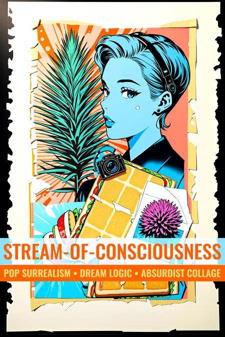 Stream-of-Consciousness works to create unusual and surprising compositions for your generation results to help create absurd, surreal and interesting collages, illustrations, portraits and so on.