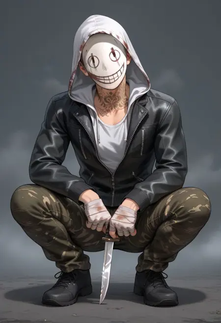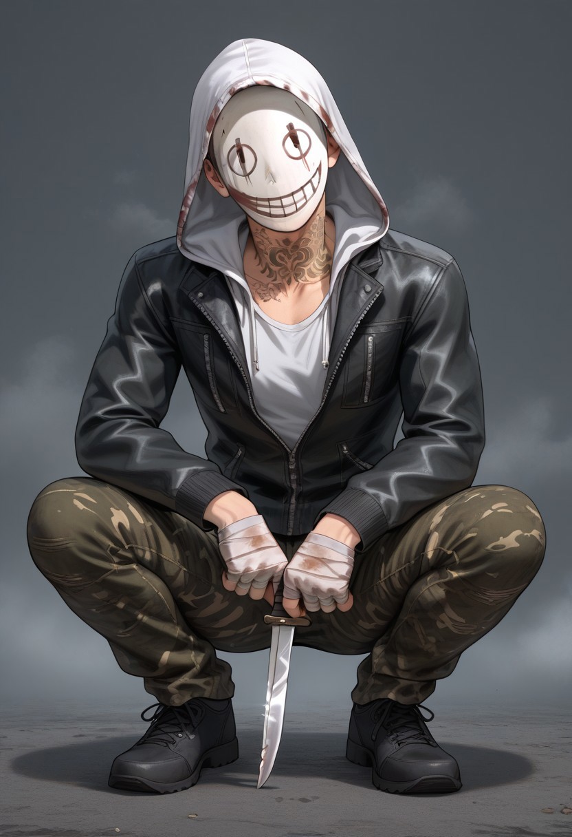- frank_morrison, light skin tone, ((neck tattoo)), leather jacket with spikes underneath, black shoes, white hood, bandaged hands, white socks, ((white legion mask, wearing a white mask, masked men, mask quality focus)), camo pants,