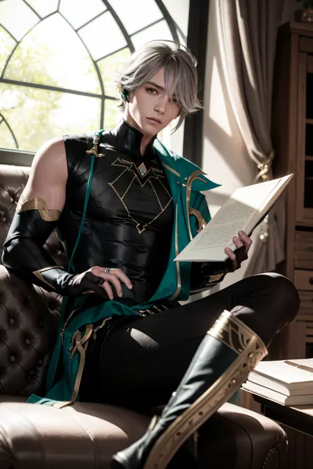 알하이잠(젠신 임팩트), 남성 중심, 1남자, 부풀어오름, 남성에게 tentacles, 솔로, tentacles, 아호게, 셔츠, 초록 망토, 한쪽 눈을 가리는 머리카락, 앞머리, 구속됨