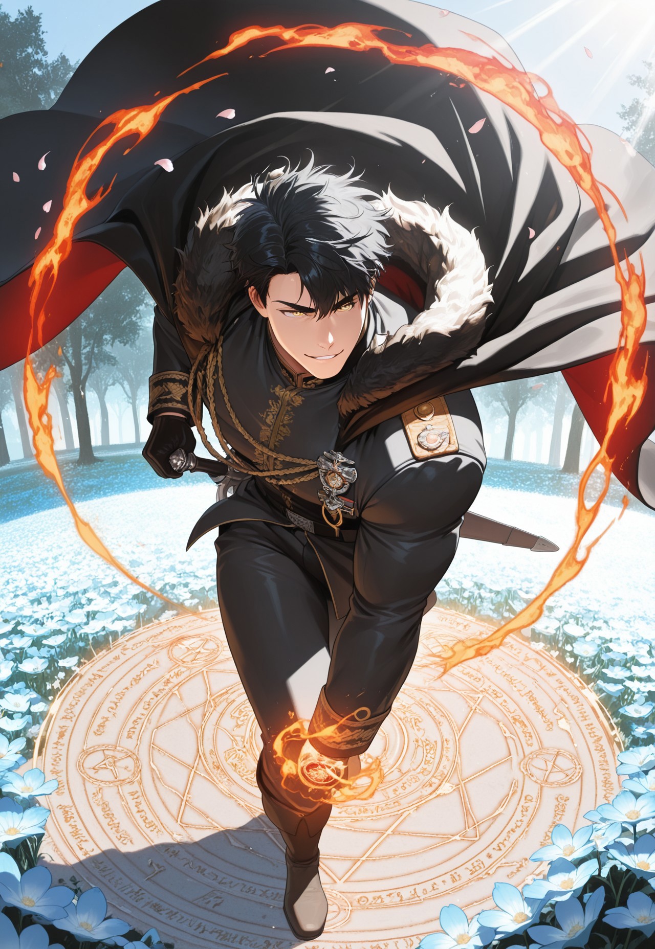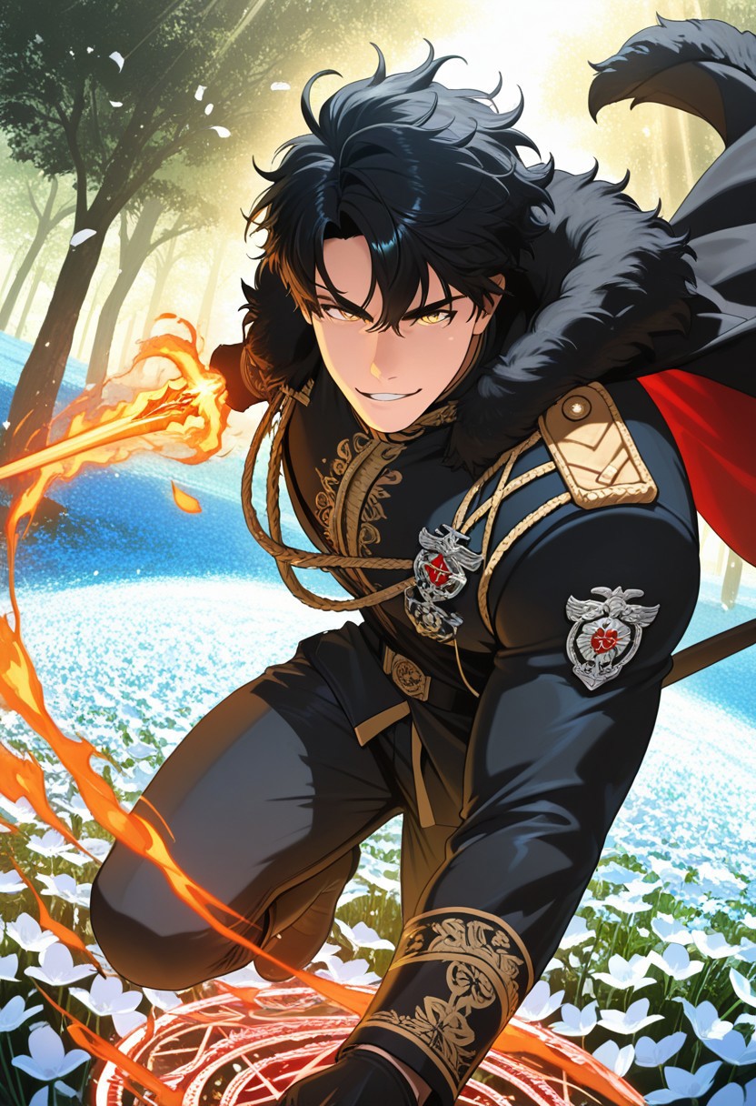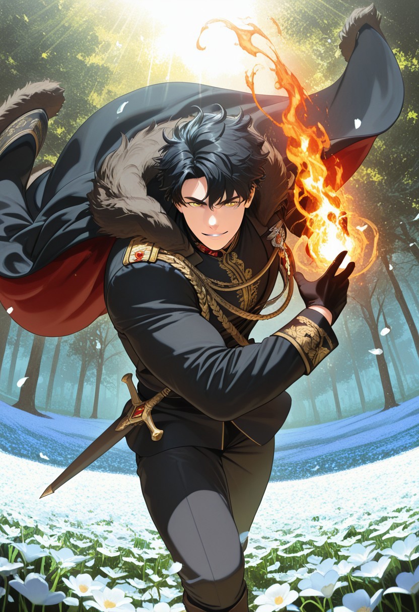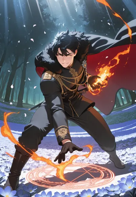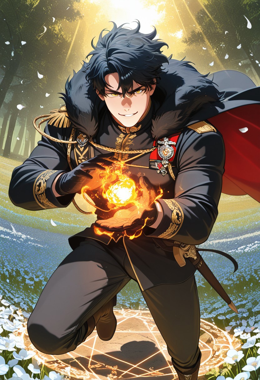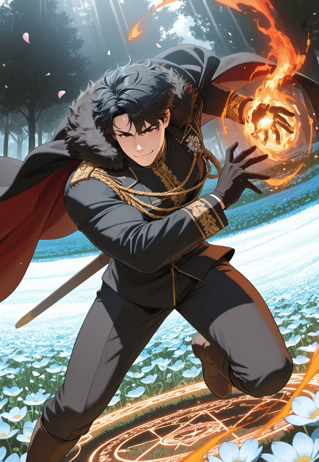 military form, fur-trimmed cape, aiguillette, gloves, spaulettes, emblem, pants, boots