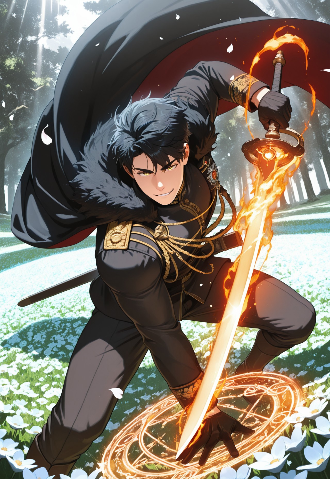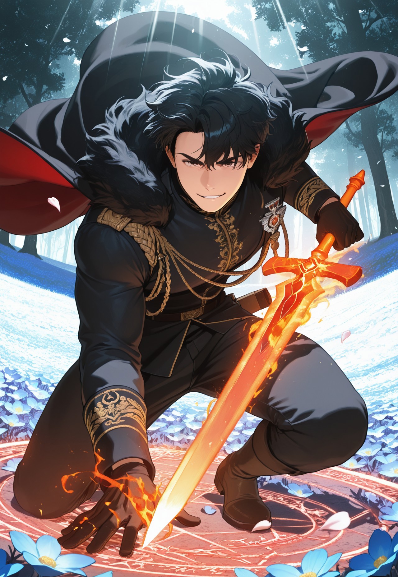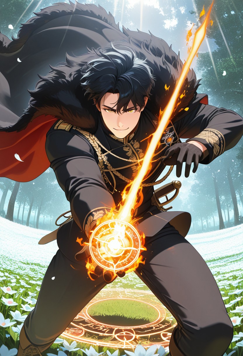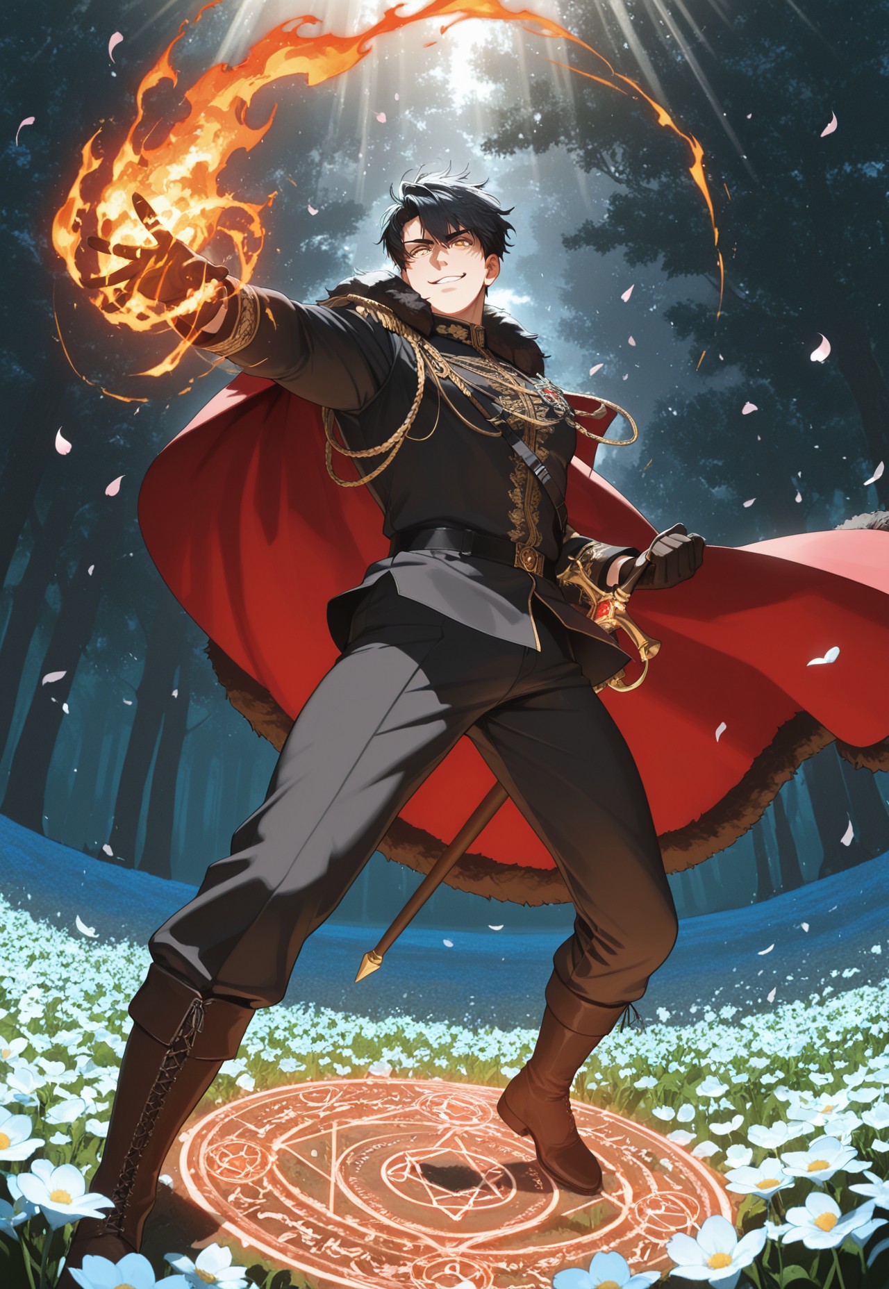 military form, fur-trimmed cape, aiguillette, gloves, spaulettes, emblem, pants, boots