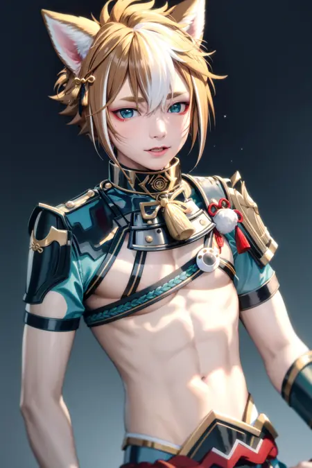 고로우 (건신 이 mandatory), 어린 소년, 1명의 소년, 남성 중심, 동물의 귀, 솔로, 여러 색상의 머리카락, 갈색 머리카락, 개 소년, 흰 머리카락, 비녀, 개 귀, 갑옷, 상체, 줄무늬 머리카락, 앞머리