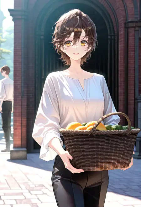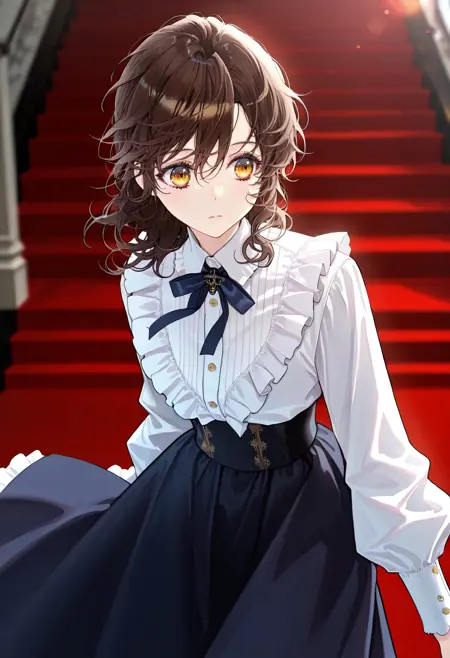 Chloe, brown hair, yellow eyes, bangs, wavy hair, short hair, hair between eyes,