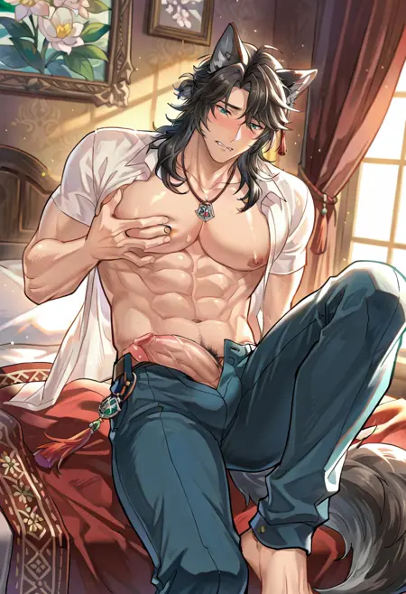 他拥有如墨滴落般的浓密黑发,每走一步都轻盈晃动的红色流苏,以及那件故意穿得松松垮垮的外套(你懂的 👀),完美诠释了“别碰狼,除非你准备好求饶”。