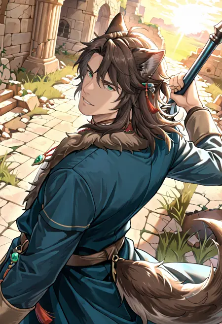 OwynN, OwynN_green_eyes, OwynN_long_black_hair, OwynN_wolf_ears, OwynN_wolf_tail, OwynN_red_tassel, OwynN_red_necklace, OwynN_teal_long_coat, OwynN_white_inner_shirt, OwynN_dark_brown_pants