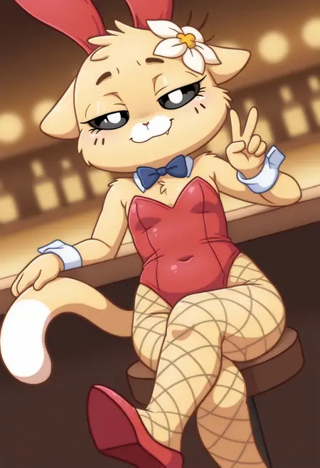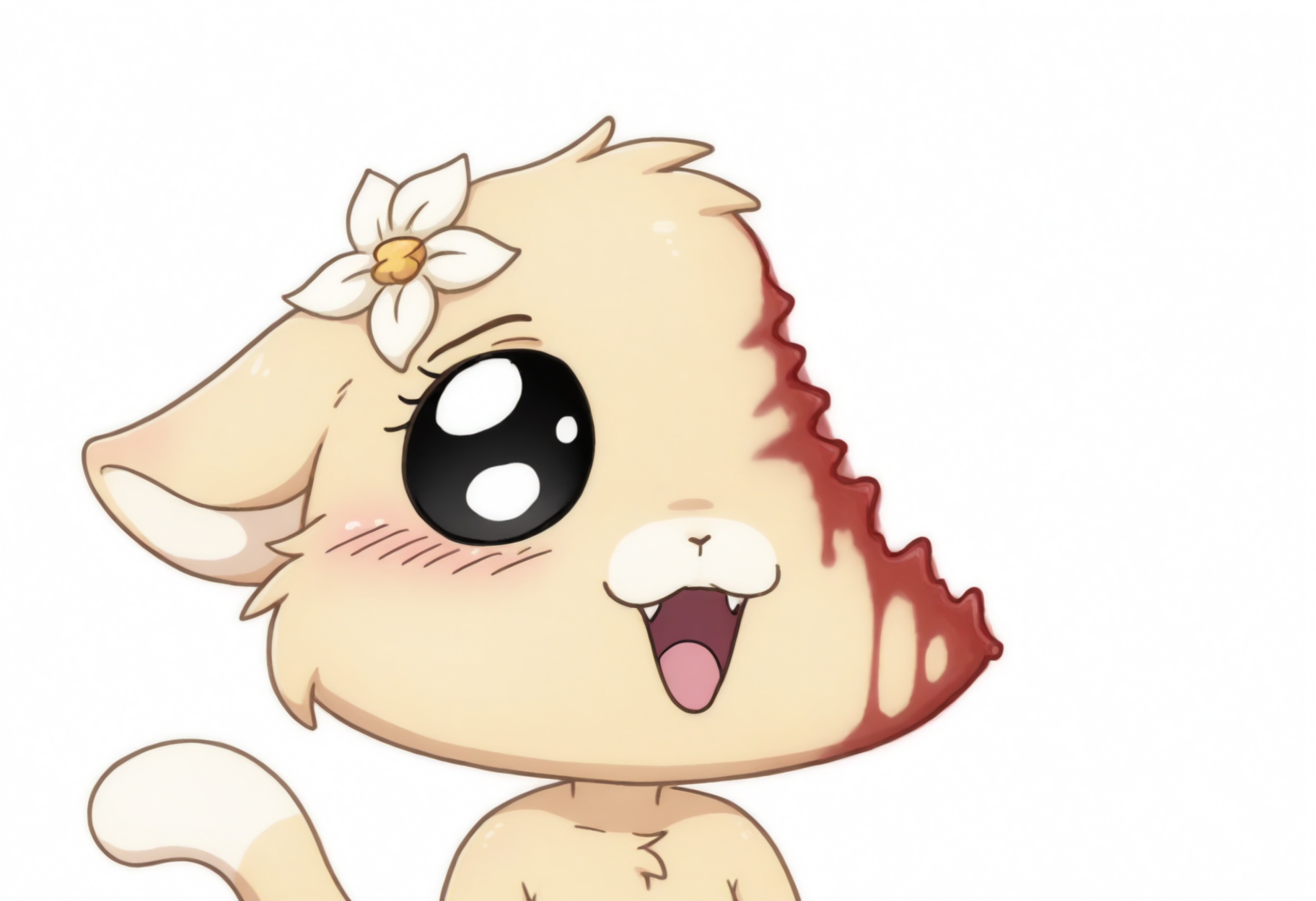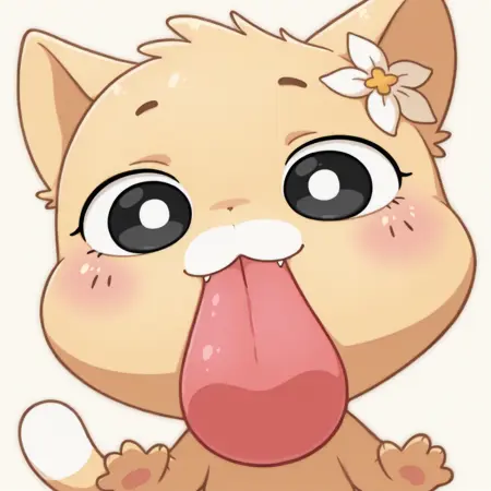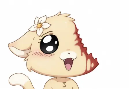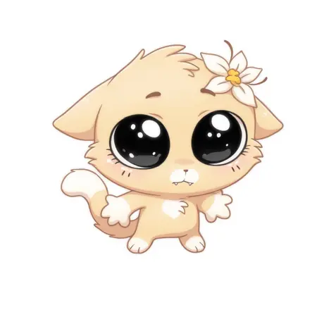 Promt: Van1lka-vkstickrs, shiny black eyes, light yellow fur, cat tail, small fangs showing, flower tucked behind one ear, chibi style