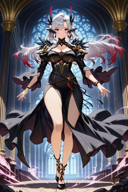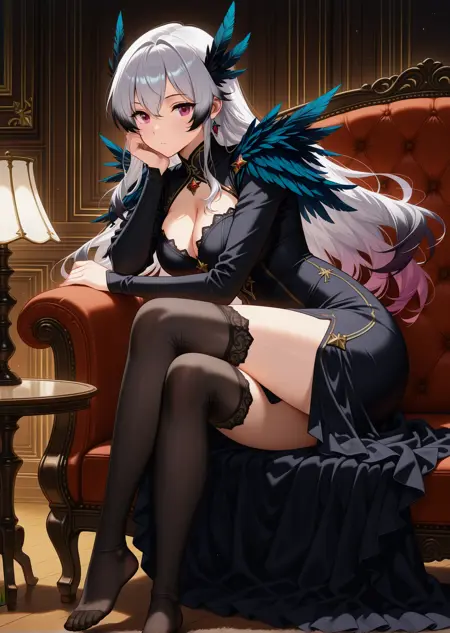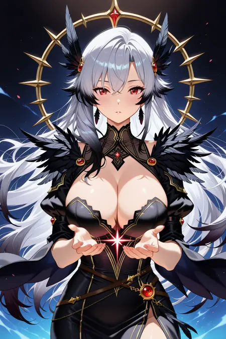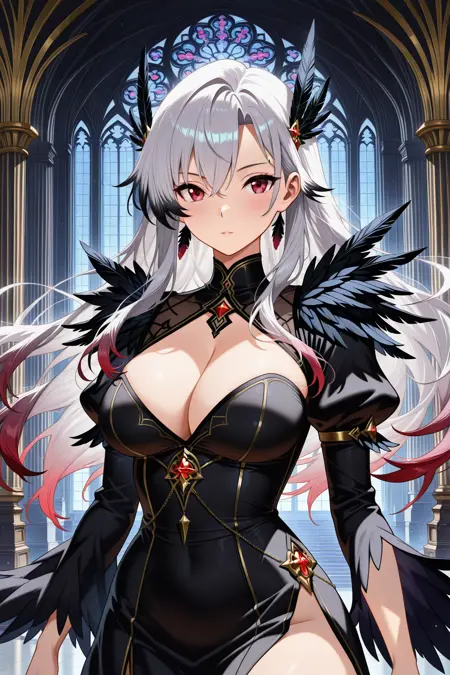 red eyes, siz, silver hair, golden trims, feather hair ornament, black gothic dress, feather shoulder pads, witch, multicolored hair, black tips on the hair, gradient hair, raven arnament