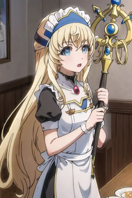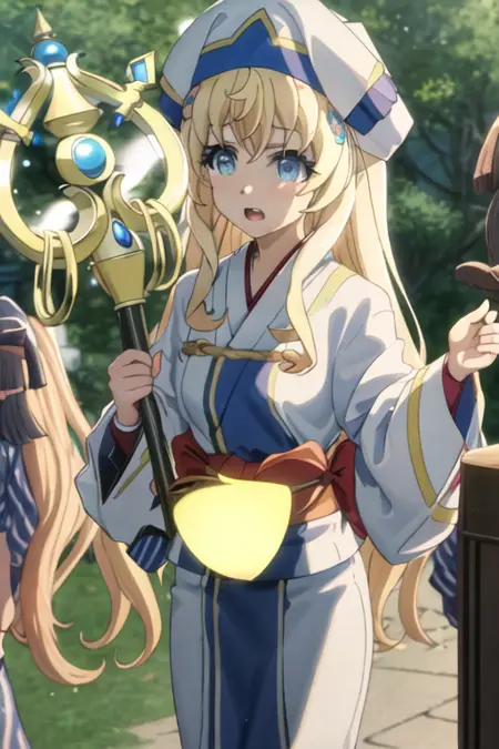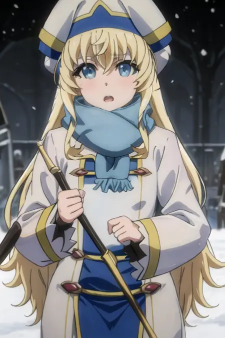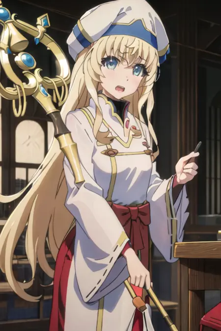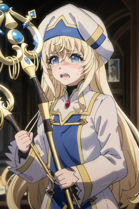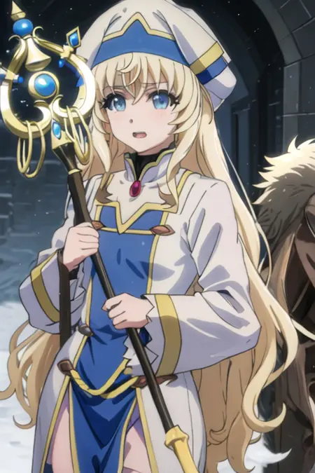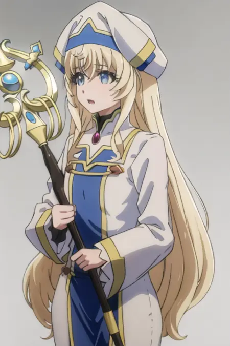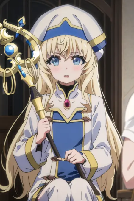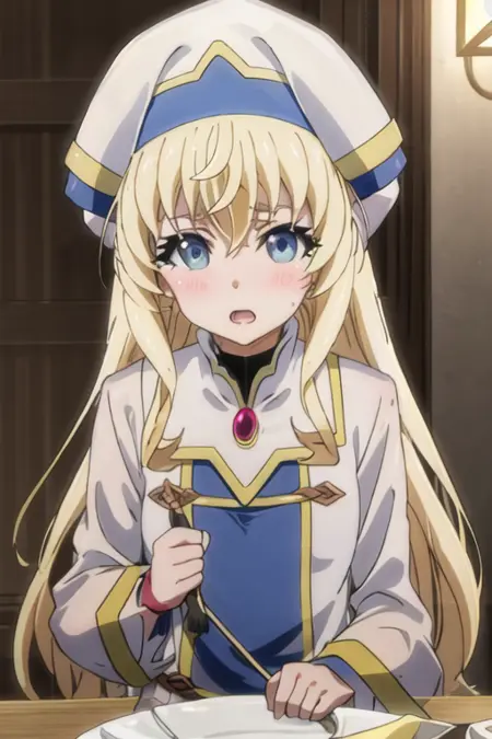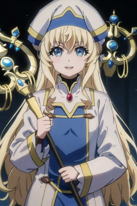 The trigger word is priestess_goblinslayer, and the recommended tags are best quality, masterpiece, highres, solo, {priestess_goblinslayer:1.15}, blonde_hair, long_hair, blue_eyes, hat, bangs, open_mouth.
