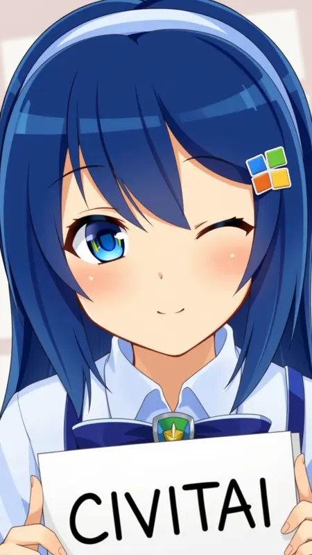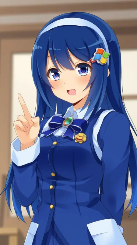 濃い青の髪、薄い青のヘアバンド、Windowsロゴの髪飾り
