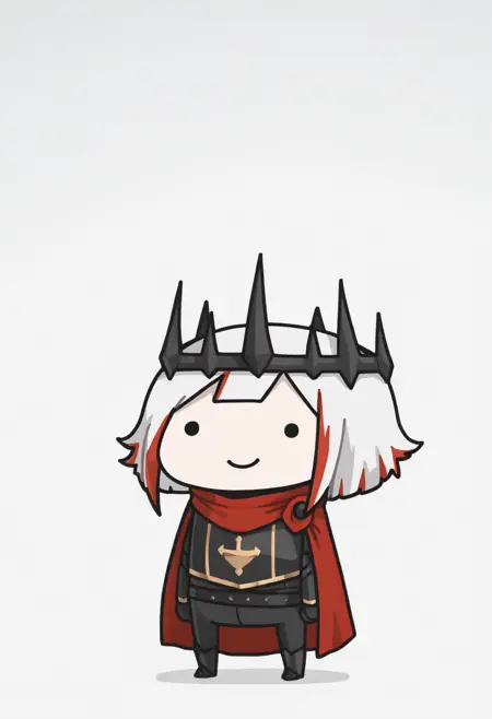 プロンプト: Ulfge-vkstickrs, 女性, 黒い目, 赤いマント, 暗い鎧, 薄い肌, 赤と白の髪, 短髪, 黒い棘のある冠