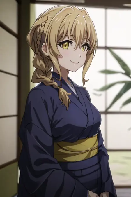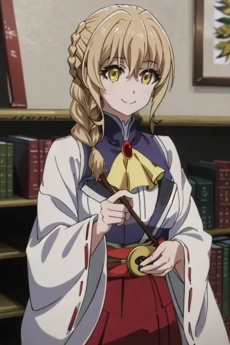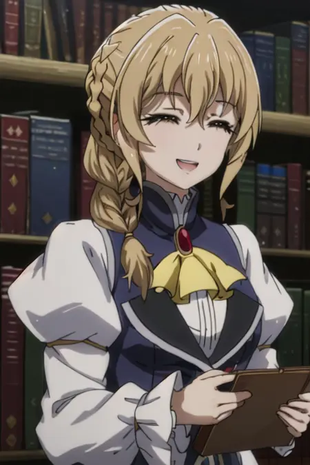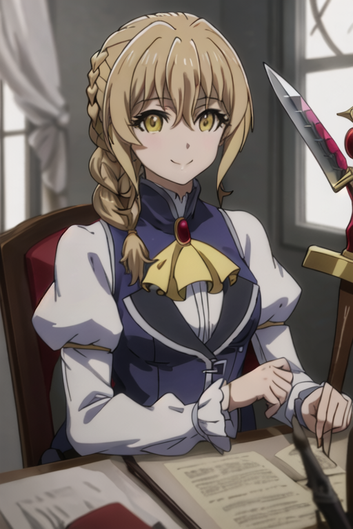 The trigger word is guild_girl_goblinslayer, and the recommended tags are best quality, masterpiece, highres, solo, {guild_girl_goblinslayer:1.15}, blonde_hair, braid, yellow_eyes, long_hair, ascot, hair_between_eyes, smile, anime_coloring.