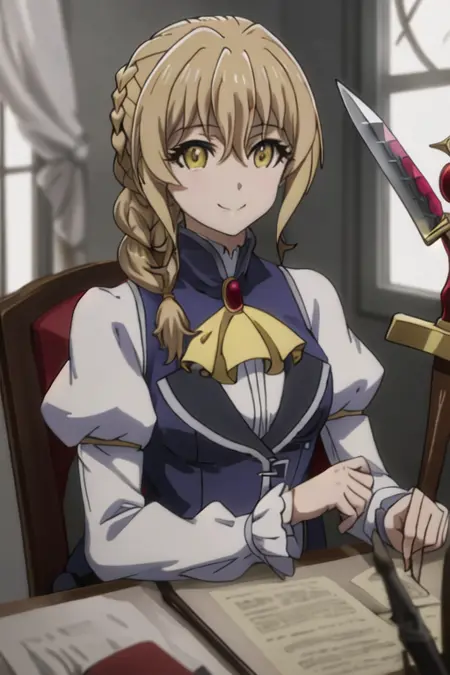트리거 단어는 guild_girl_goblinslayer이며, 권장 태그는 best quality, masterpiece, highres, solo, {guild_girl_goblinslayer:1.15}, blonde_hair, braid, yellow_eyes, long_hair, ascot, hair_between_eyes, smile, anime_coloring입니다.