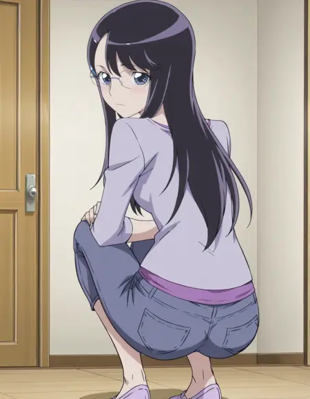 动漫截图,单人,1女孩,tsukikageyuri,眼镜,长裤,休闲,紫色衬衫,紫色夹克,七分裤,lora:tsukikageyuri_IL:0.8高清,绝佳画质,最佳画质,非常美观,杰作,absurdres,