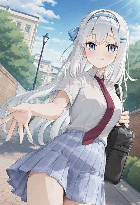 koyuki_shirogane,1girl,solo,long hair,white hair,blue eyes,hair ornament,hairclip,hairband,school uniform,red necktie,white shirt,collared shirt,short sleeves,pleated skirt,plaid skirt,school bag,