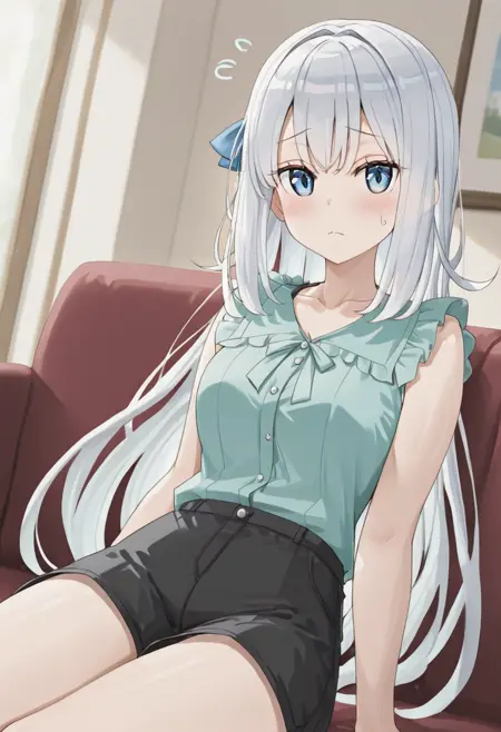koyuki_shirogane,1girl,solo,long hair,white hair,blue eyes,aqua shirt,sleeveless shirt,collarbone,frilled shirt,buttons,frilled shirt collar,black shorts,short shorts,