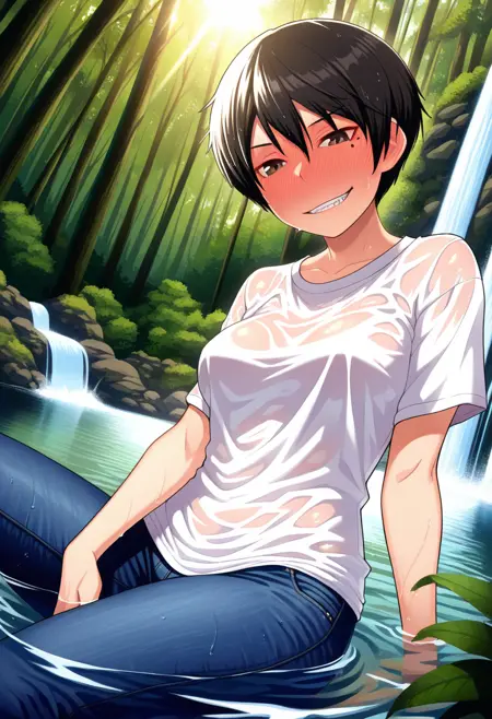 - fumikoww, tomboy, brown eyes, black hair, short hair, mole under eye, medium breasts,