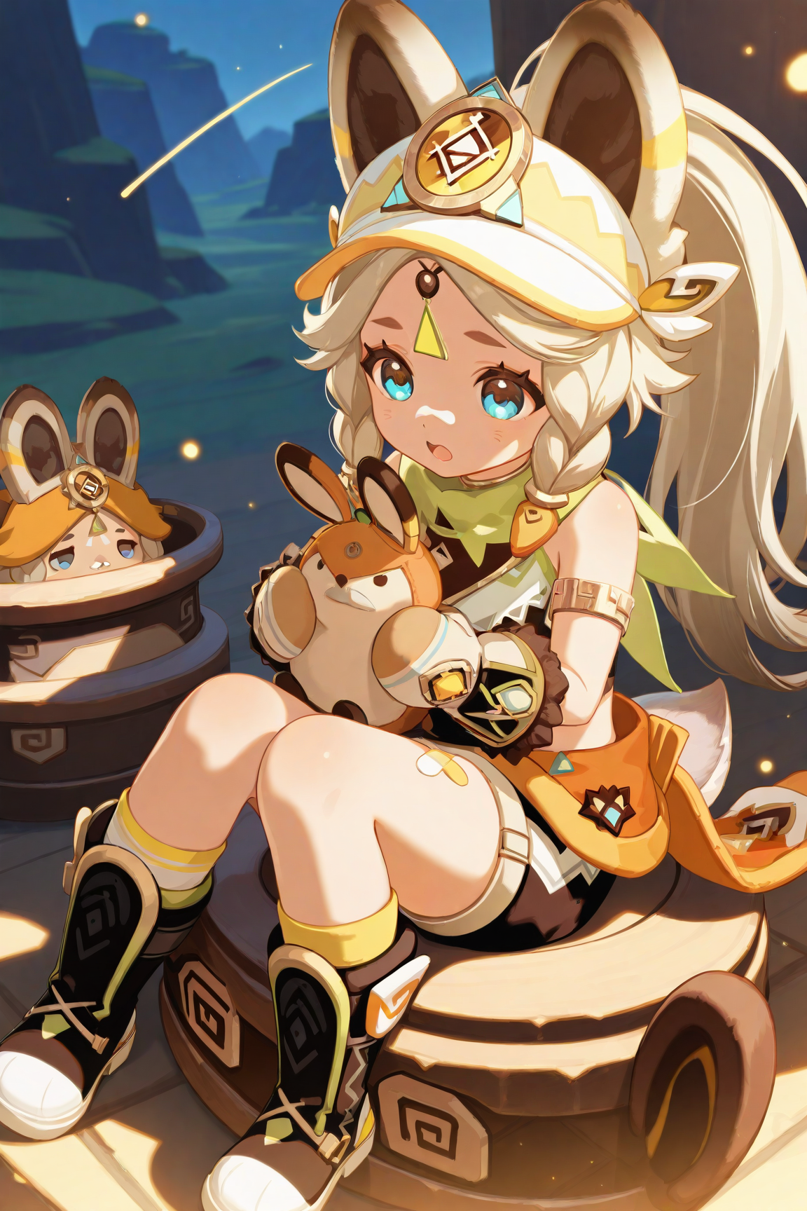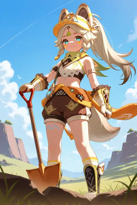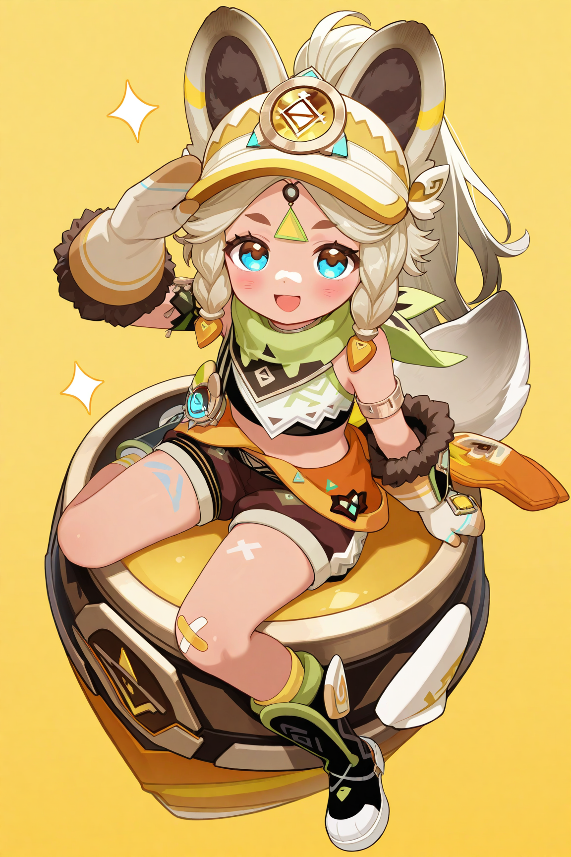 kachina \(genshin impact\), 1girl, solo, animal ears, tail, braid, bandaid on leg, long hair, bandaid, bandaid on knee, thick eyebrows, ponytail, animal ears, visor cap, blush, gloves, fur trim, black shorts, ponytail, yellow headwear, notice lines, puffy shorts