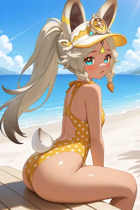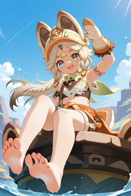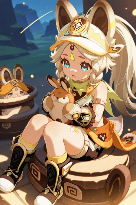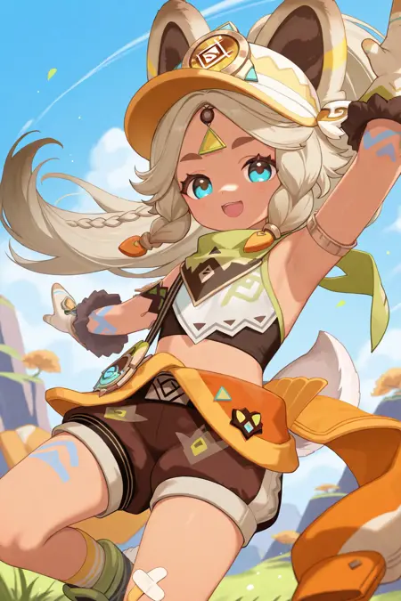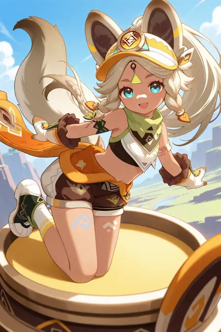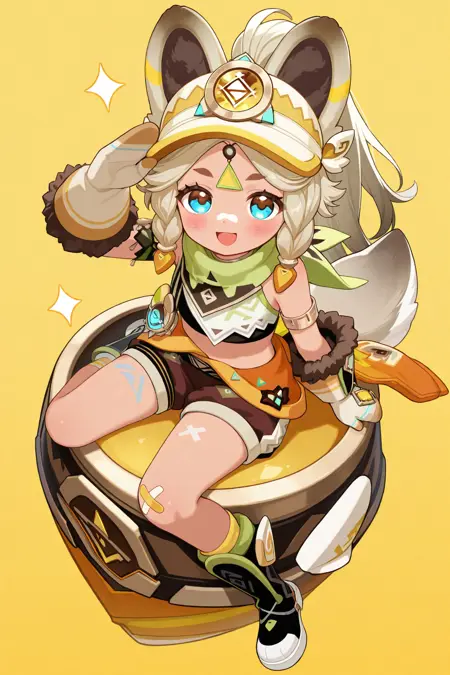 kachina \(原神\), 1个女孩, 单人, 动物耳朵, 尾巴, 辫子, 腿部有胶布, 长发, 胶布, 膝盖有胶布, 浓眉, 马尾, 动物耳朵, 面罩帽, 脸红, 手套, 毛皮镶边, 黑色短裤, 马尾, 黄色头饰, 明线, 蓬松短裤