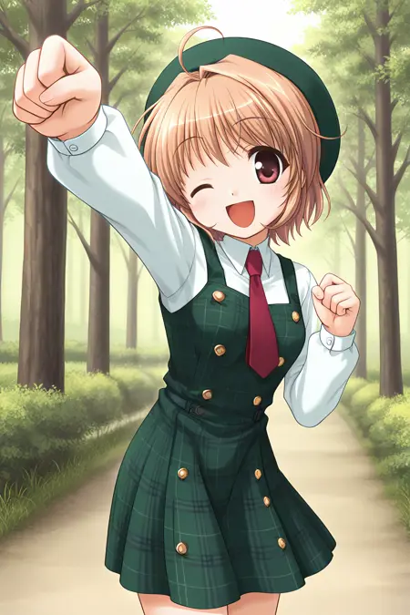 베레모, 녹색 머리장식, 녹색 드레스, 피노포어 드레스, 체크무늬 드레스, 더블브레스트, 흰 셔츠, 드레스 셔츠, 긴 소매, 빨간 넥타이, 허리 리본, 검은 리본,