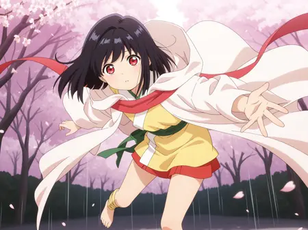 Yui_Senyasyo, black hair, medium hair, red eyes, white hooded robe, yellow short kimono, white lapels, red scarf, hood down,long sleeves, wide sleeves,green sash, sash under robe, red petticoat,yellow leg ribbon, barefoot,