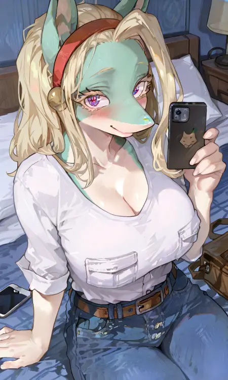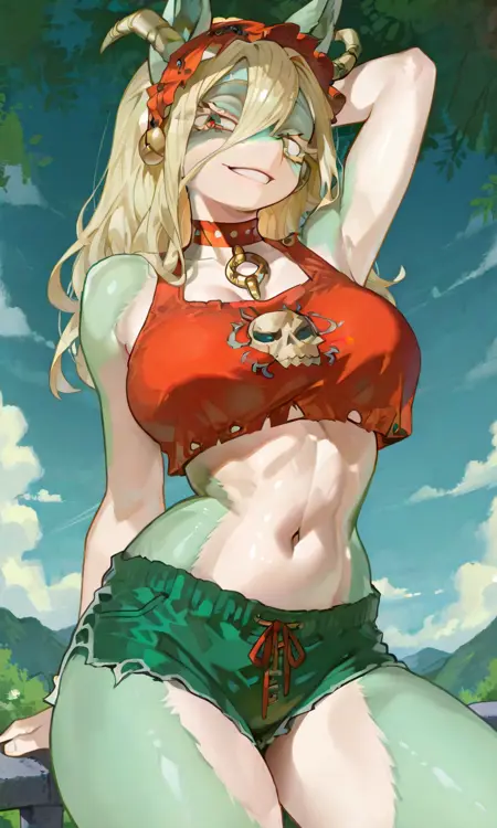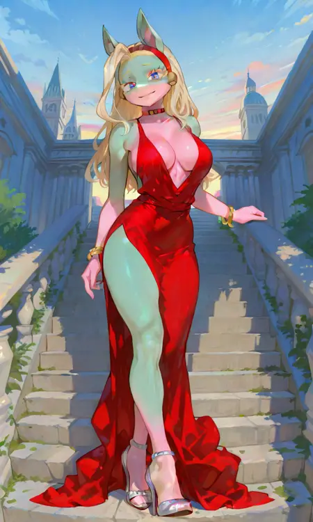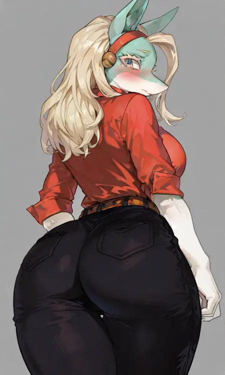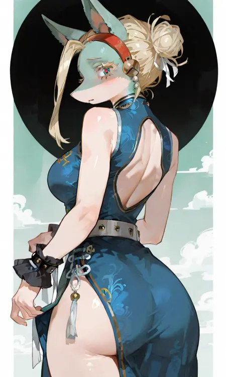 また、彼女の基本的なキャラクター特性を説明する以下のキーワードも同等に重要です:成熟した、人間型、狐のような女性、巨大女性、非常に背が高く曲線的、薄い青緑色の毛皮、白い毛皮の斑点、肩までの薄い金髪、右目にかかる長い前髪、赤いヘッドバンド、薄い青い目、濃いまつ毛、長く尖った耳