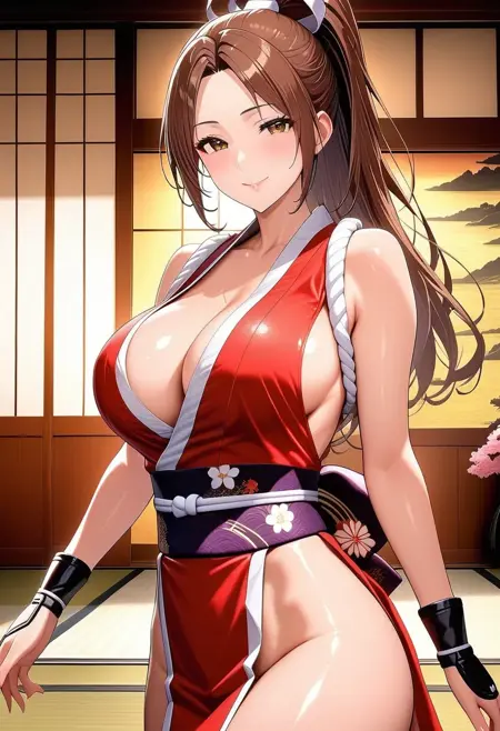 Trigger words: mai_a_xl, brown hair, long hair,parted bangs, high ponytail,brown eyes, red sleeveless kimono, japanese clothes,revealing clothes, obi, wrist guards,