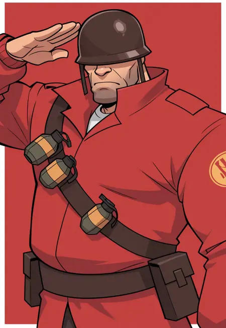 soldier (tf2), mature man, helmet, hidden eyes, white shirt, red coat, belt, belt pouch, brown pants, black shoes,