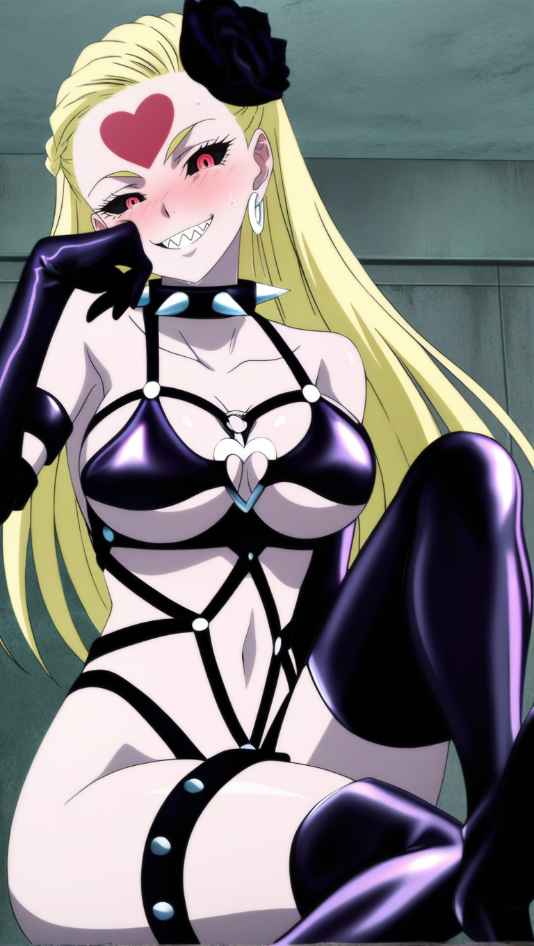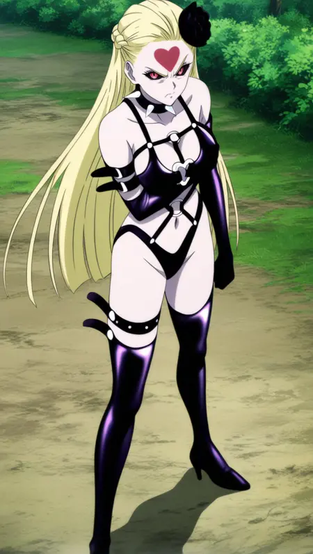 BDSM 服装,泳装,乳房,大乳房,发饰,黑花,头发花朵,手套,肚脐,黑色手套,肘部手套,项圈,带刺项圈,面具,BDSM,尖刺,O型环,女支配者,过膝长筒袜,黑色过膝长筒袜,大腿靴,高跟鞋,