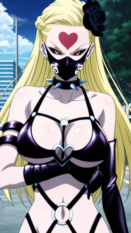 BDSM衣装、水着、胸、大きな胸、髪飾り、黒い花、花の髪飾り、手袋、へそ、黒い手袋、肘まである手袋、首輪、釘付き首輪、マスク、BDSM、釘、Oリング、ドミニクス、太ももハイ、黒い太ももハイ、太ももブーツ、ハイヒール、