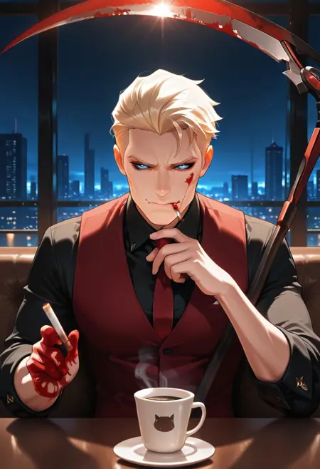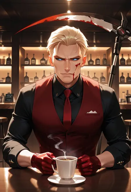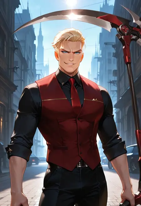 KallebKross, hollow cheeks, narrow cheekbones, black shirt and red vest, red tie, blond hair,