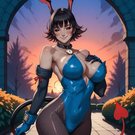 トリガー語(リリ): LiliBS、ショートヘア、黒髪、黒目、時計、チョーカー、ウサギ耳、青いウサギ服、手袋、タイツ、尾、悪魔の尾、