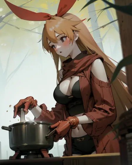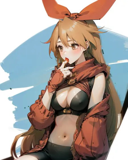 prompt:1girl,hair ribbon,long hair,cleavage,shorts