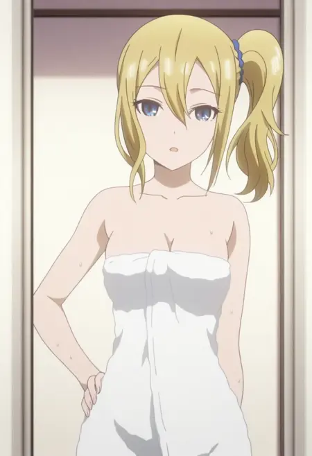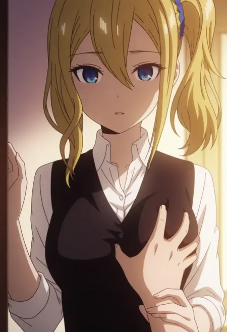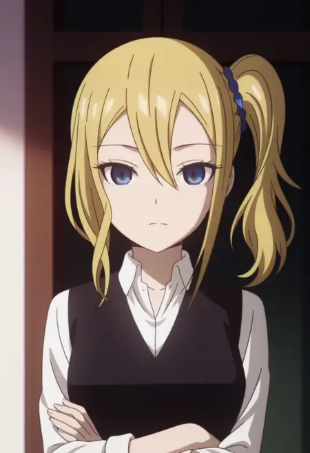 1girl, hayasaka ai, blue eyes, blonde hair, hair between eyes, bangs, side ponytail, sidelocks,