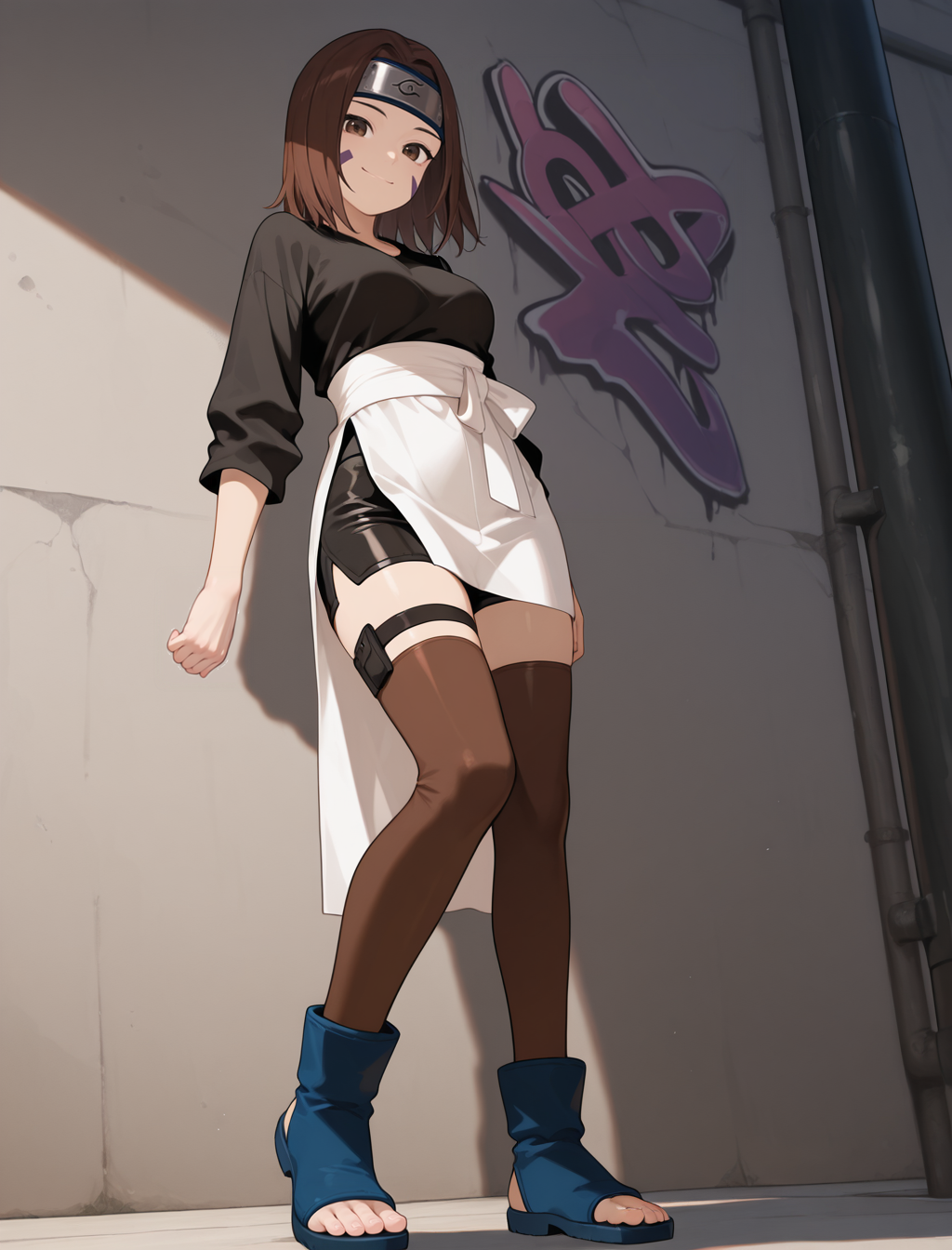 Outfit: forehead protector, Konohagakure Symbol, ninja headband, black shirt, long sleeves, side slit white skirt with sash, white sash, black shorts, thigh strap, brown thighhighs, toeless footwear, blue footwear