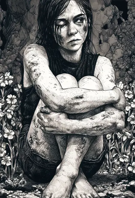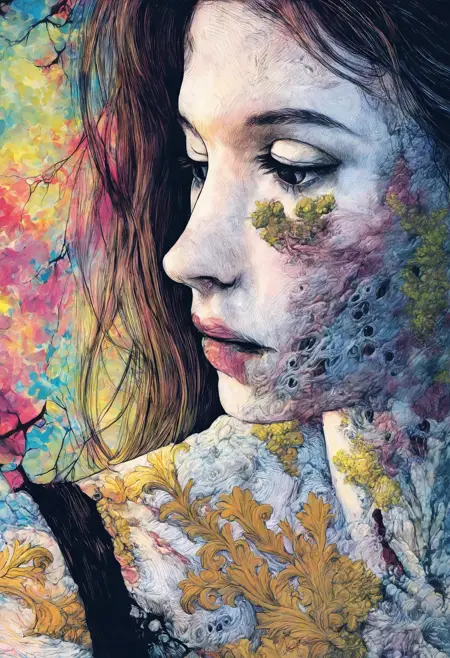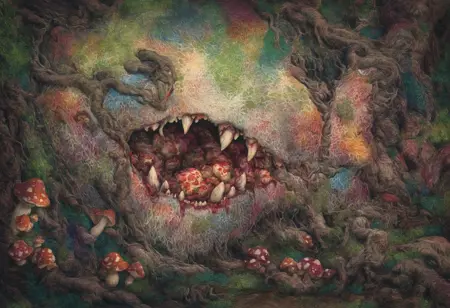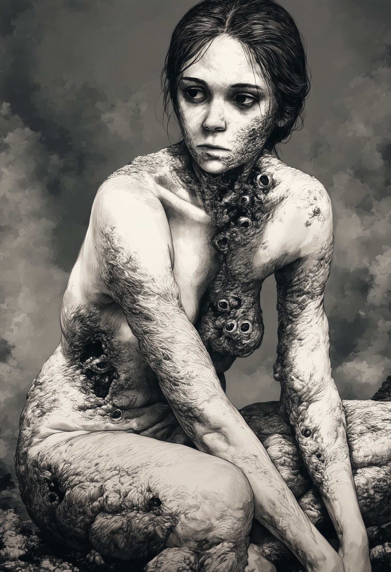 Content Keywords: "fine detail" and "decay" to get the approximate style. Add "body horror" to get the weird stuff. Roots, vines, teeth, organs, entrails, blood, etc to add more gross detail.