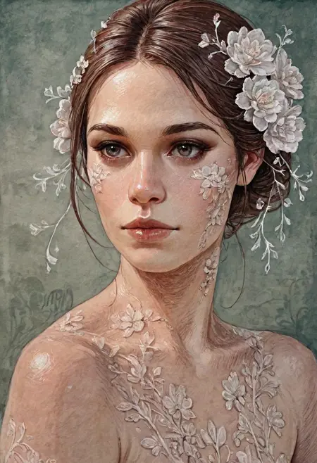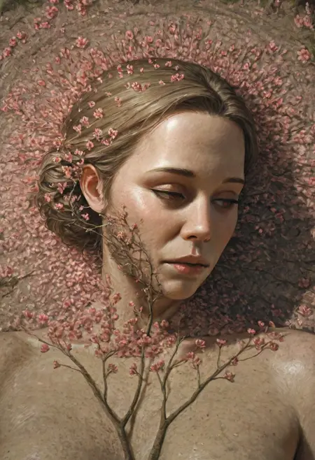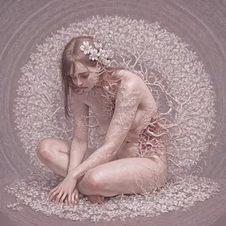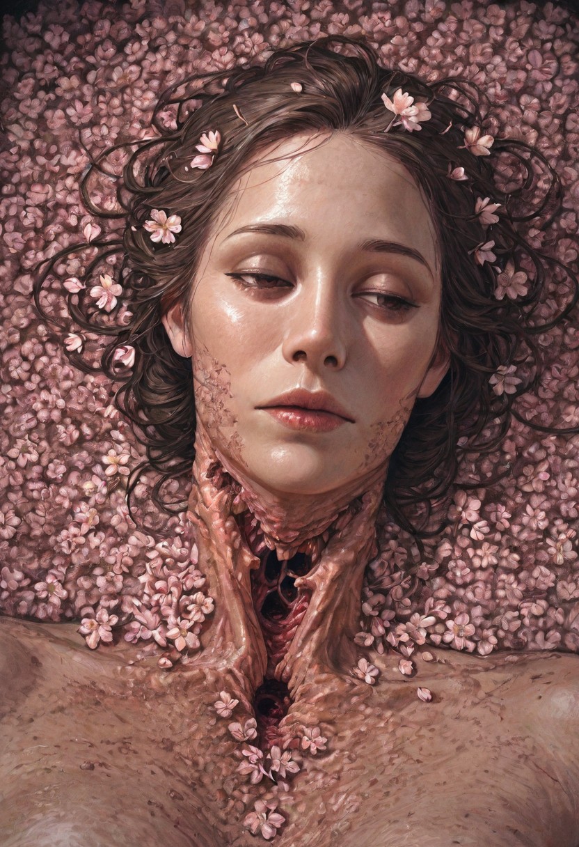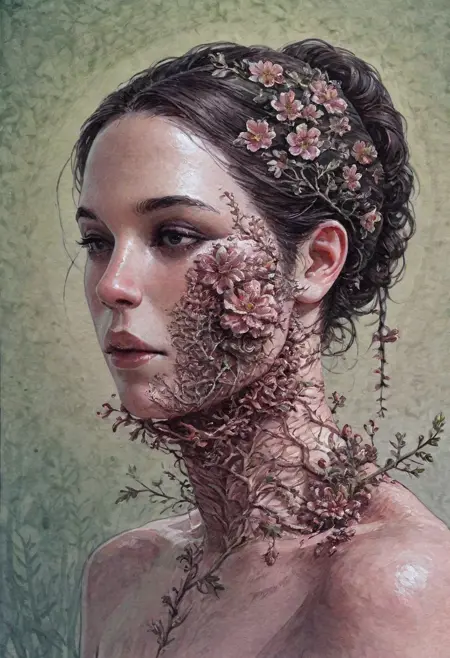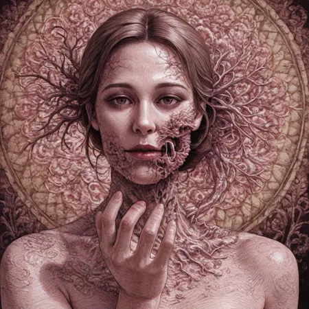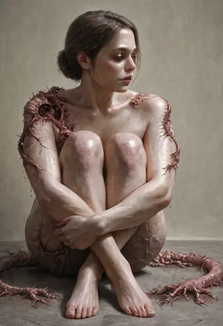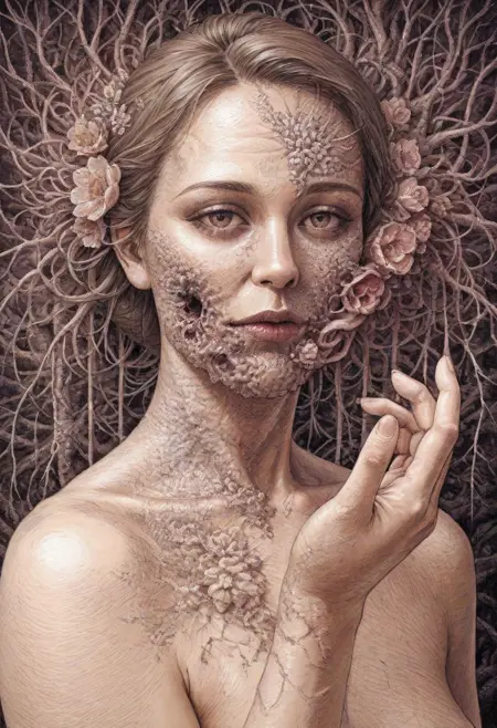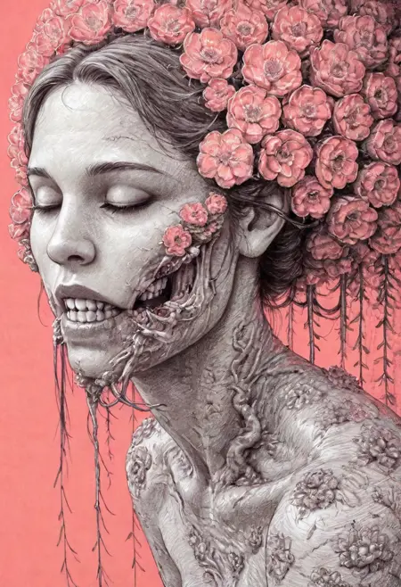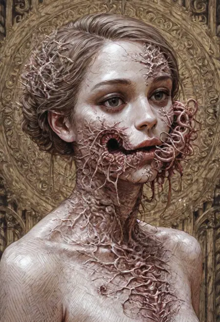 内容关键词:使用“fine detail”和“decay”以接近其风格;添加“body horror”以获得怪异元素;加入 roots(根须)、vines(藤蔓)、teeth(牙齿)、organs(器官)、entrails(内脏)、blood(血液)等以增加更多瘆人细节。