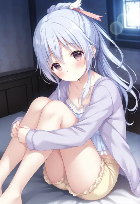 high ponytail,hair ribbon,pink ribbon,wing hair ornament,pajamas,yellow shorts,long sleeves,open cardigan,short shorts,blue camisole,frilled camisole,purple cardigan,frilled shorts,white frills,