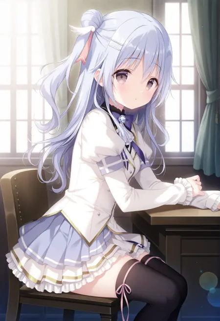 wing hair ornament,hair ribbon,pink ribbon,parallel hairclips,school uniform,black thighhighs,pleated skirt,sleeves past wrists,white jacket,buttons,white ascot,diamond brooch,blue gemstone,puffy short sleeves,layered sleeves,frilled sleeves,short over long sleeves,purple sleeve cuffs,purple bowtie,black shirt,juliet sleeves,blue skirt,white skirt,gold trim,frilled skirt,white frills,layered skirt,thigh ribbon,miniskirt,