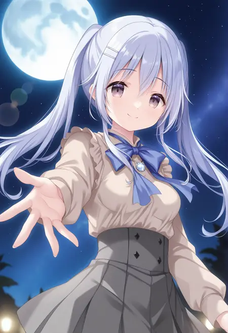 twintails,parallel hairclips,casual,long sleeves,pleated skirt,grey skirt,light brown shirt,frilled shirt,collared shirt,high-waist skirt,blue bowtie,diamond brooch,blue gemstone,