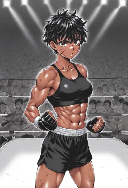 MaoMao, 1girl, tomboy, dark-skinned_female, brown_skin, short_hair, black_hair, messy_hair, thick_eyebrows, muscular, abs, biceps, triceps, athletic body, toned, toned_body, biceps, medium_breasts, midriff, navel, toned body, scars, scars on face, body scars, mma sports bra, mma shorts, mma gloves, fingerless gloves