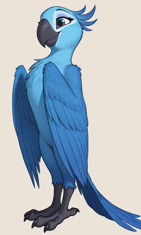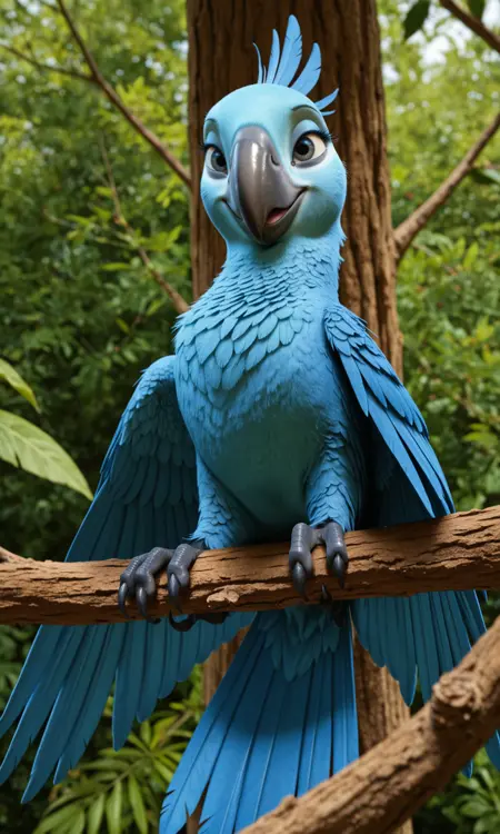 Jewel-Rio, 斯皮克斯金刚鹦鹉, 蓝眼睛, 浅蓝色脸部, 黑色喙, 蓝色羽毛, 黑色眼睛, 爪子上有黑色爪子, 黑条纹鸟足, 蓝色羽毛尾巴, 蓝色翅膀,